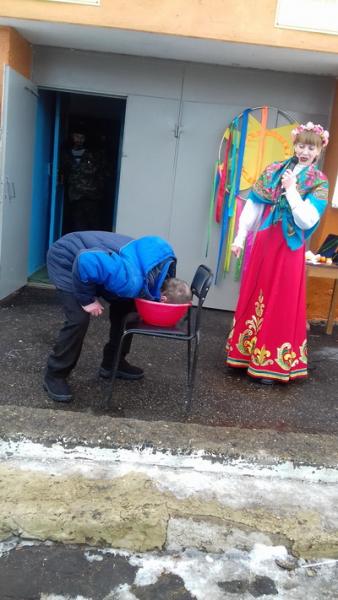 На развернувшейся игровой площадке под задорную народную музыку ведущая, Скоморохи и девушки приглашали сельчан на потешки народные да игры весёлые. Чуть позже к ним присоединился Медведь, который, проспав всю зиму, также захотел поиграть и поесть блинов.