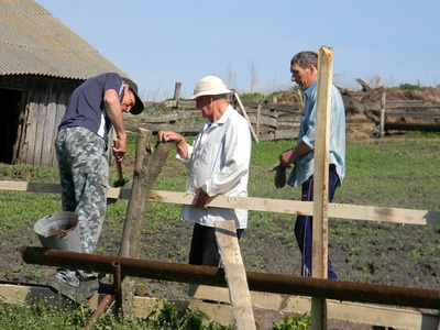 В с.Чертас мы осмотрели ход ремонтных работ, которые вела наёмная бригада строителей. Здесь нас встретил главный зоотехник агрофирмы И.Н.Чевердин, который рассказал о режиме труда рабочих, о маршруте передвижения стада и организации поения коров: